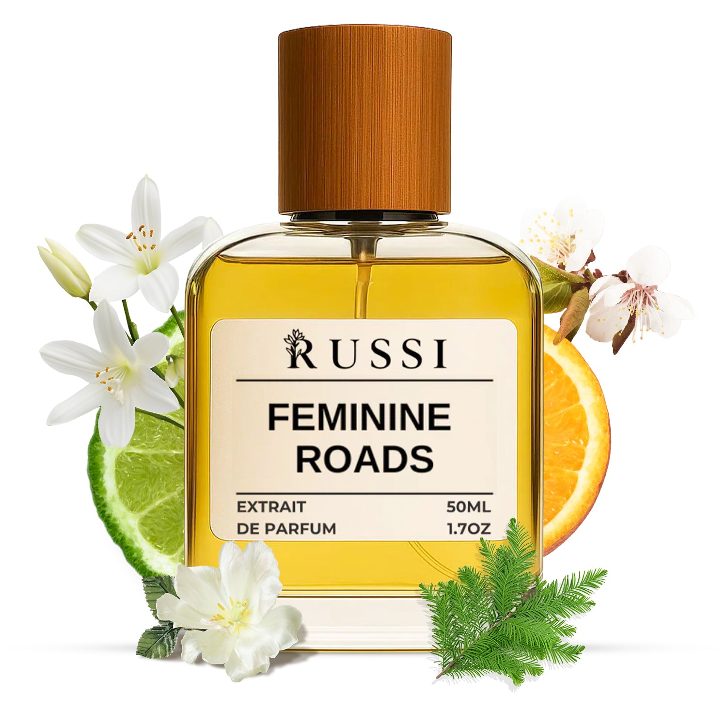 FEMININE ROADS ir viegls, ziedu un nedaudz citrusaugļu Extrait de Parfum, kas balstīts uz Giorgio Armani My Way. Apelsīnu ziedi, tuberoze, vaniļa un ciedrs rada aromātu ceļojošai, pasaulīgai sievietei.